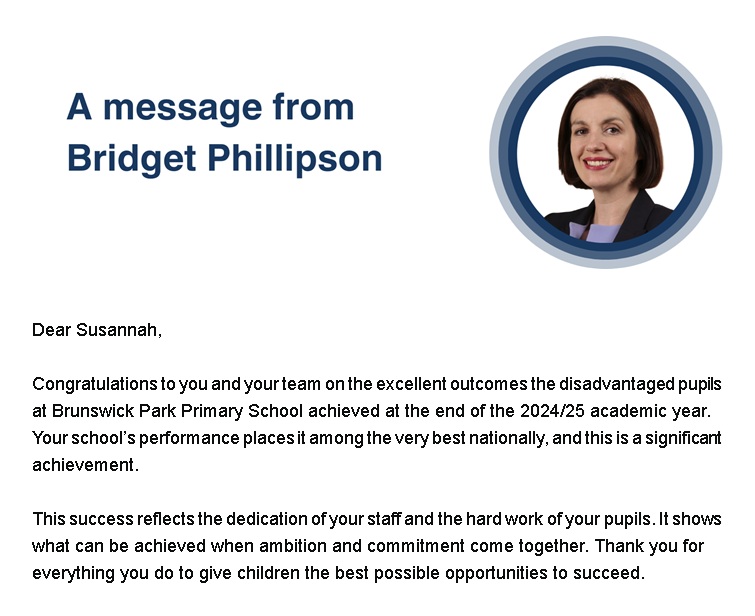 Brunswick Park Primary School is very pleased to announce that it recently received a letter of congratulations from Bridget Phillipson, Secretary of State for Education regarding “Excellent outcomes for disadvantaged pupils…